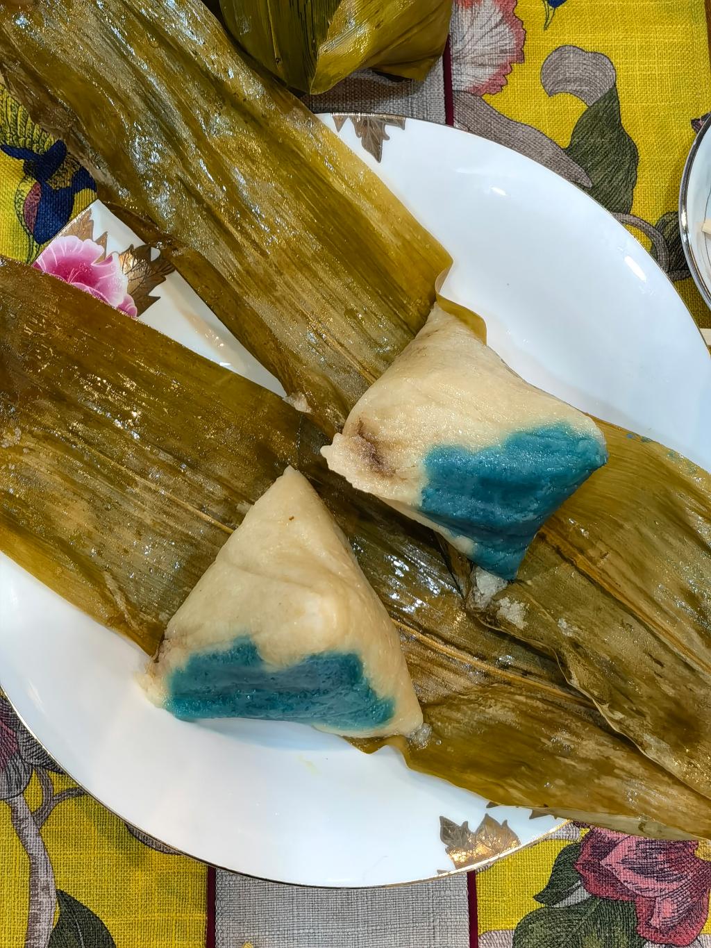来自缅甸的柯志明对来自新加坡的金珠粽子和辣味粽子非常感兴趣,他介绍了缅甸的粽子做法。