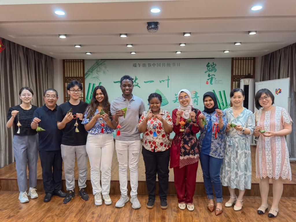 北到蒙古国的奶酪粽子,南到新加坡的金珠、紫薯粽子,西到缅甸的辣味粽子,东到墨西哥的鸡肉粽子,更有中国传统的甜味咸味粽子。在孔丽娜老师的带领下,师生以粽子为媒介,开展了一场美食盛宴和饮食文化对比交流。苇叶、竹叶、芭蕉叶,糯米、黄米、香米,填料从大枣、蛋黄到排骨、鸡肉、紫薯、辣椒,挖掘食品密码、道出文化内涵,探寻的是对中国文化的共同热爱。