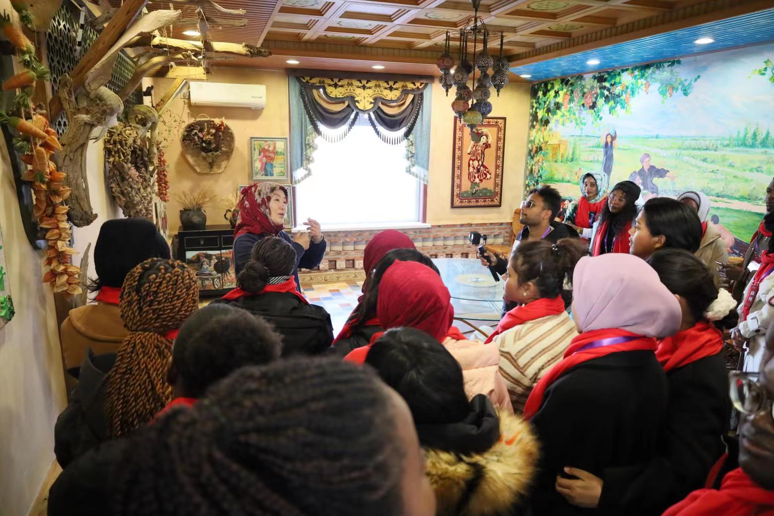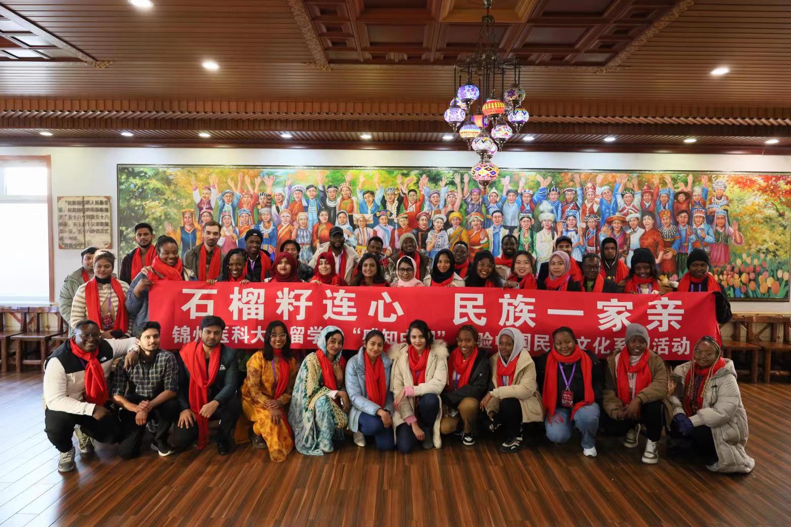 为增进职工对中国民族团结、民族风俗等文化的了解,加深来华职工们对中国文化的热爱和认同,12月1日,太阳成集团tyc122ccvip组织来自莱索托、坦桑尼亚、巴基斯坦等12个国家的职工及全体职工辅导员共40余人,前往锦州市太和区大薛街道三屯村,走进“石榴家园”,走到最美“新疆汉族妈妈”芦志红身边。
